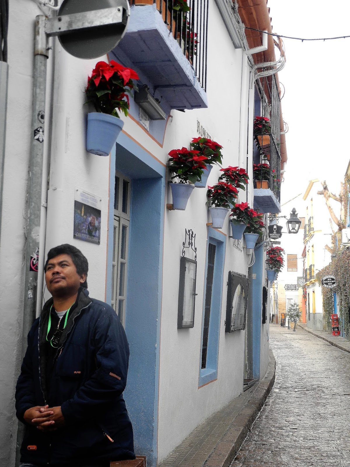 | Melalui Calle Deanes dihiasi pasu-pasu bunga terracotta berwarna merah tergantung di dinding-dinding dan balkoni. |